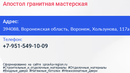 Апостол, гранитная мастерская по адресу 394088, Воронежская область, Воронеж, Хользунова, 117а в дальнейшем Организация, размещена в следующих категориях: