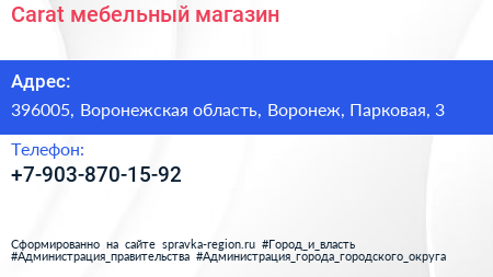Carat, мебельный магазин по адресу 396005, Воронежская область, Воронеж, Парковая, 3 в дальнейшем Организация, размещена в следующих категориях: