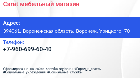 Carat, мебельный магазин по адресу 394061, Воронежская область, Воронеж, Урицкого, 70 в дальнейшем Организация, размещена в следующих категориях:
