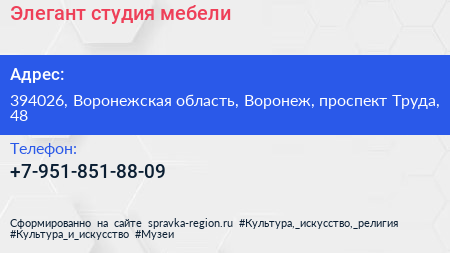 Элегант, студия мебели по адресу 394026, Воронежская область, Воронеж, проспект Труда, 48 в дальнейшем Организация, размещена в следующих категориях: