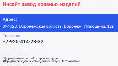 Инсайт, завод кованых изделий по адресу 394028, Воронежская область, Воронеж, Ильюшина, 12в в дальнейшем Организация, размещена в следующих категориях: