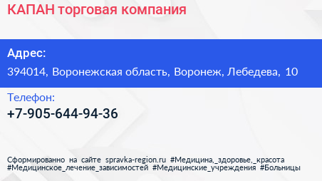 КАПАН, торговая компания по адресу 394014, Воронежская область, Воронеж, Лебедева, 10 в дальнейшем Организация, размещена в следующих категориях: