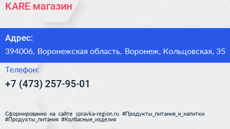 KARE, магазин по адресу 394006, Воронежская область, Воронеж, Кольцовская, 35 в дальнейшем Организация, размещена в следующих категориях: