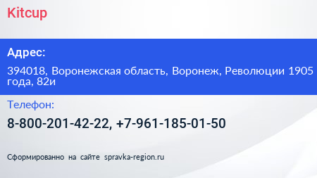 Kitcup по адресу 394018, Воронежская область, Воронеж, Революции 1905 года, 82и в дальнейшем Организация, размещена в следующих категориях: