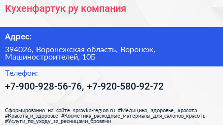 Кухенфартук.ру, компания по адресу 394026, Воронежская область, Воронеж, Машиностроителей, 10Б в дальнейшем Организация, размещена в следующих категориях: