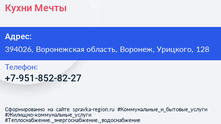 Кухни Мечты по адресу 394026, Воронежская область, Воронеж, Урицкого, 128 в дальнейшем Организация, размещена в следующих категориях: