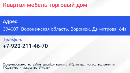 Квартал мебель, торговый дом по адресу 394007, Воронежская область, Воронеж, Димитрова, 64а в дальнейшем Организация, размещена в следующих категориях:
