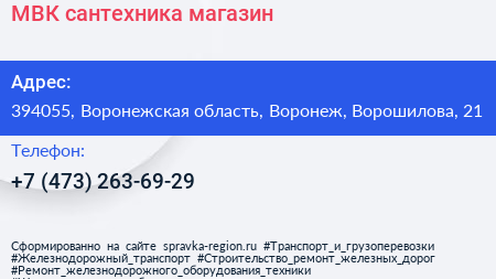 МВК сантехника, магазин по адресу 394055, Воронежская область, Воронеж, Ворошилова, 21 в дальнейшем Организация, размещена в следующих категориях:
