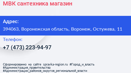 МВК сантехника, магазин по адресу 394063, Воронежская область, Воронеж, Остужева, 11 в дальнейшем Организация, размещена в следующих категориях: