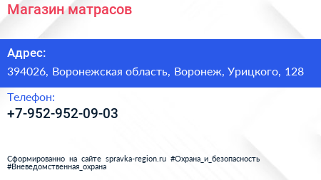 Магазин матрасов по адресу 394026, Воронежская область, Воронеж, Урицкого, 128 в дальнейшем Организация, размещена в следующих категориях: