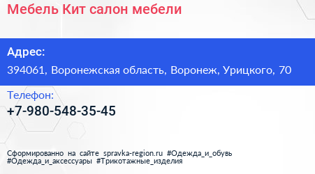 Мебель-Кит, салон мебели по адресу 394061, Воронежская область, Воронеж, Урицкого, 70 в дальнейшем Организация, размещена в следующих категориях: