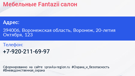 Мебельные Fantazii, салон по адресу 394006, Воронежская область, Воронеж, 20-летия Октября, 123 в дальнейшем Организация, размещена в следующих категориях: