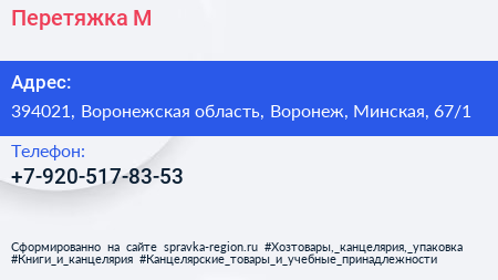 Перетяжка-М по адресу 394021, Воронежская область, Воронеж, Минская, 67/1 в дальнейшем Организация, размещена в следующих категориях: