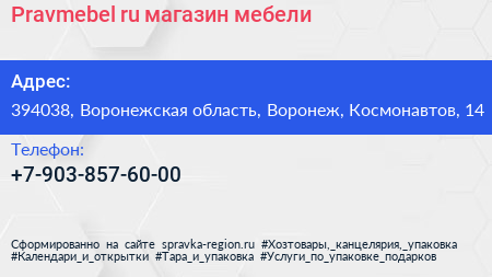 Pravmebel.ru, магазин мебели по адресу 394038, Воронежская область, Воронеж, Космонавтов, 14 в дальнейшем Организация, размещена в следующих категориях: