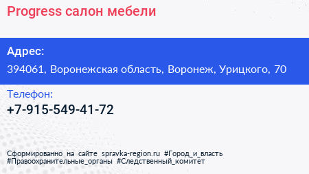 Progress, салон мебели по адресу 394061, Воронежская область, Воронеж, Урицкого, 70 в дальнейшем Организация, размещена в следующих категориях: