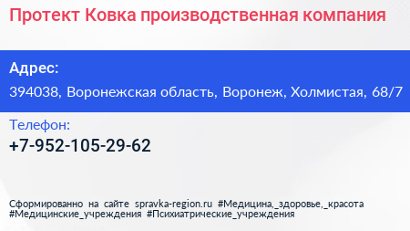 Протект Ковка, производственная компания по адресу 394038, Воронежская область, Воронеж, Холмистая, 68/7 в дальнейшем Организация, размещена в следующих категориях: