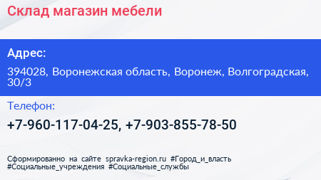 Склад-магазин мебели по адресу 394028, Воронежская область, Воронеж, Волгоградская, 30/3 в дальнейшем Организация, размещена в следующих категориях: