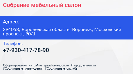 Собрание, мебельный салон по адресу 394053, Воронежская область, Воронеж, Московский проспект, 90/1 в дальнейшем Организация, размещена в следующих категориях: