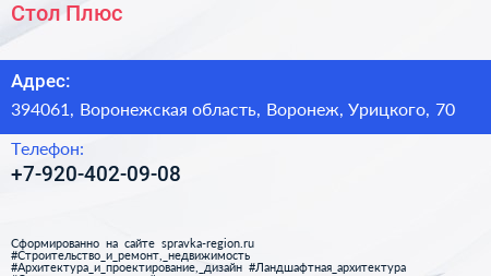 Стол Плюс по адресу 394061, Воронежская область, Воронеж, Урицкого, 70 в дальнейшем Организация, размещена в следующих категориях: