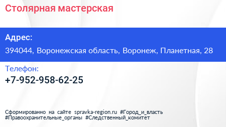 Столярная мастерская по адресу 394044, Воронежская область, Воронеж, Планетная, 28 в дальнейшем Организация, размещена в следующих категориях:
