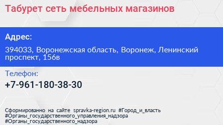 Табурет, сеть мебельных магазинов по адресу 394033, Воронежская область, Воронеж, Ленинский проспект, 156в в дальнейшем Организация, размещена в следующих категориях: