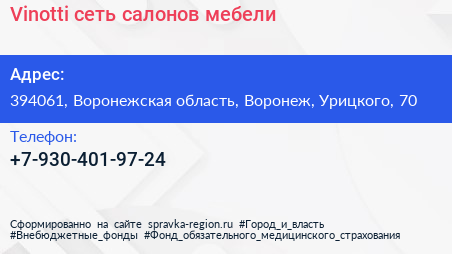Vinotti, сеть салонов мебели по адресу 394061, Воронежская область, Воронеж, Урицкого, 70 в дальнейшем Организация, размещена в следующих категориях: