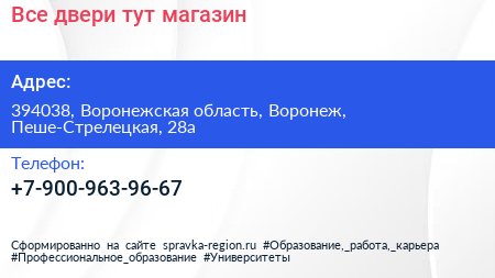Все двери тут, магазин по адресу 394038, Воронежская область, Воронеж, Пеше-Стрелецкая, 28а в дальнейшем Организация, размещена в следующих категориях: