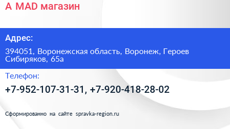A-MAD, магазин по адресу 394051, Воронежская область, Воронеж, Героев Сибиряков, 65а в дальнейшем Организация, размещена в следующих категориях:
