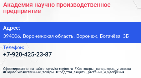 Академия, научно-производственное предприятие по адресу 394006, Воронежская область, Воронеж, Богачёва, 3Б в дальнейшем Организация, размещена в следующих категориях: