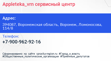 Appleteka_vrn, сервисный центр по адресу 394087, Воронежская область, Воронеж, Ломоносова, 114/8 в дальнейшем Организация, размещена в следующих категориях: