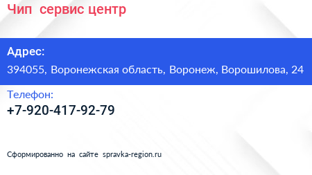 Чип+, сервис-центр по адресу 394055, Воронежская область, Воронеж, Ворошилова, 24 в дальнейшем Организация, размещена в следующих категориях: