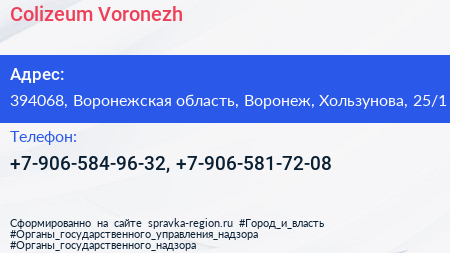 Colizeum Voronezh по адресу 394068, Воронежская область, Воронеж, Хользунова, 25/1 в дальнейшем Организация, размещена в следующих категориях: