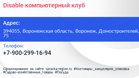 Disable, компьютерный клуб по адресу 394055, Воронежская область, Воронеж, Домостроителей, 75 в дальнейшем Организация, размещена в следующих категориях: