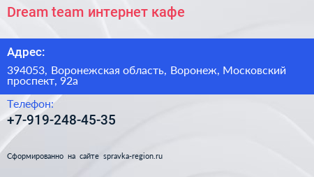 Dream team, интернет-кафе по адресу 394053, Воронежская область, Воронеж, Московский проспект, 92а в дальнейшем Организация, размещена в следующих категориях: