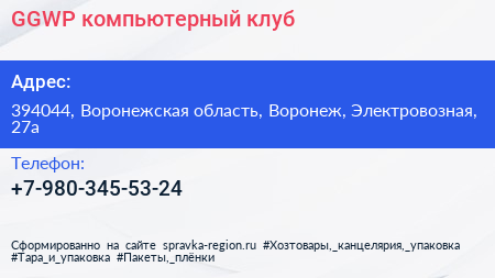 GGWP, компьютерный клуб по адресу 394044, Воронежская область, Воронеж, Электровозная, 27а в дальнейшем Организация, размещена в следующих категориях: