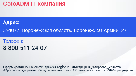 GotoADM, IT-компания по адресу 394077, Воронежская область, Воронеж, 60 Армии, 27 в дальнейшем Организация, размещена в следующих категориях: