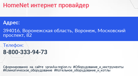 HomeNet, интернет-провайдер по адресу 394016, Воронежская область, Воронеж, Московский проспект, 82 в дальнейшем Организация, размещена в следующих категориях: