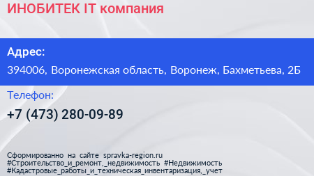 ИНОБИТЕК, IT-компания по адресу 394006, Воронежская область, Воронеж, Бахметьева, 2Б в дальнейшем Организация, размещена в следующих категориях: