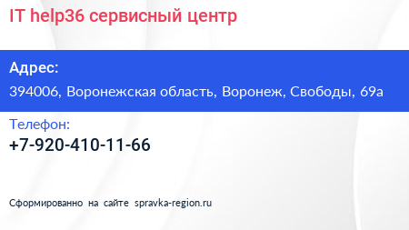 IT help36, сервисный центр по адресу 394006, Воронежская область, Воронеж, Свободы, 69а в дальнейшем Организация, размещена в следующих категориях: