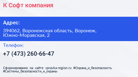 К-Софт, компания по адресу 394062, Воронежская область, Воронеж, Южно-Моравская, 2 в дальнейшем Организация, размещена в следующих категориях: