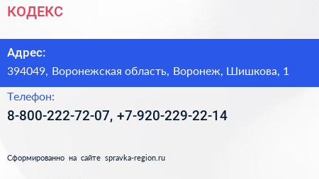 КОДЕКС по адресу 394049, Воронежская область, Воронеж, Шишкова, 1 в дальнейшем Организация, размещена в следующих категориях: