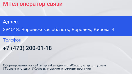 МТел, оператор связи по адресу 394018, Воронежская область, Воронеж, Кирова, 4 в дальнейшем Организация, размещена в следующих категориях: