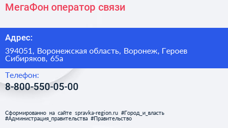 МегаФон, оператор связи по адресу 394051, Воронежская область, Воронеж, Героев Сибиряков, 65а в дальнейшем Организация, размещена в следующих категориях: