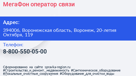 МегаФон, оператор связи по адресу 394006, Воронежская область, Воронеж, 20-летия Октября, 119 в дальнейшем Организация, размещена в следующих категориях: