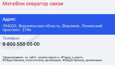 МегаФон, оператор связи по адресу 394033, Воронежская область, Воронеж, Ленинский проспект, 174п в дальнейшем Организация, размещена в следующих категориях: