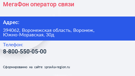 МегаФон, оператор связи по адресу 394062, Воронежская область, Воронеж, Южно-Моравская, 30д в дальнейшем Организация, размещена в следующих категориях: