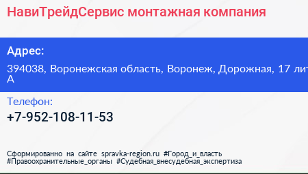 НавиТрейдСервис, монтажная компания по адресу 394038, Воронежская область, Воронеж, Дорожная, 17 лит А в дальнейшем Организация, размещена в следующих категориях:
