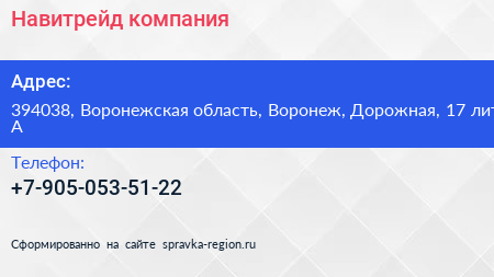 Навитрейд, компания по адресу 394038, Воронежская область, Воронеж, Дорожная, 17 лит А в дальнейшем Организация, размещена в следующих категориях: