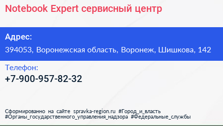 Notebook Expert, сервисный центр по адресу 394053, Воронежская область, Воронеж, Шишкова, 142 в дальнейшем Организация, размещена в следующих категориях: