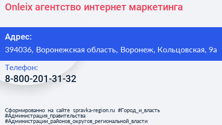 Onleix, агентство интернет маркетинга по адресу 394036, Воронежская область, Воронеж, Кольцовская, 9а в дальнейшем Организация, размещена в следующих категориях: